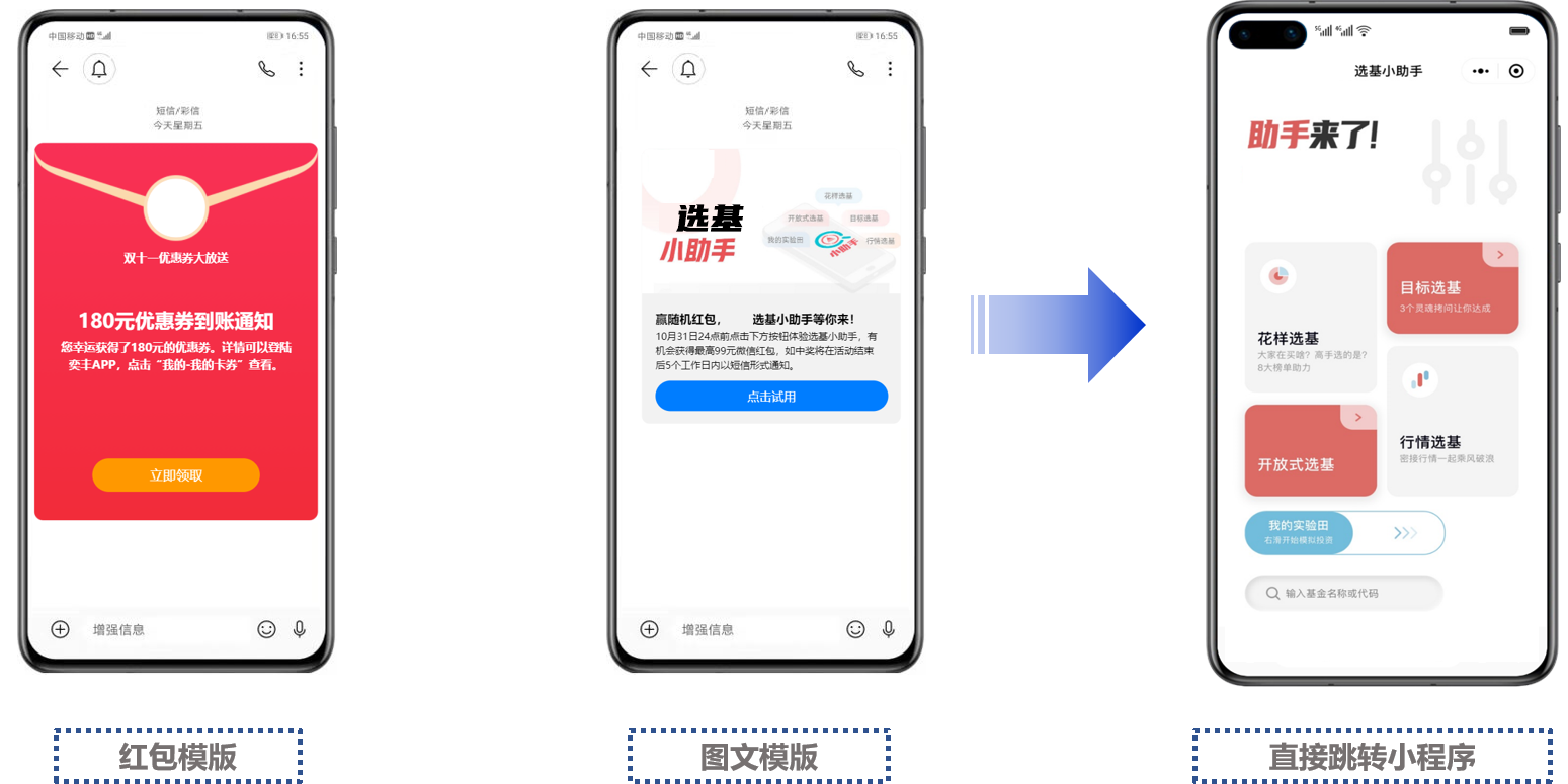 现在不管是APP还是小程序,拉新促活的成本都越来越高,尤其针对金融行业的用户运营来说,除了简单的引导用户下载APP,更重要是顺利获得运营手段激活用户,转化为有价值的用户。从这一点出发,royal皇家88(集团) 科技5G消息解决方案新增了多种样式的消息模板,支持采用图文+红包文案的方式助力基金行业高效拉新促活。