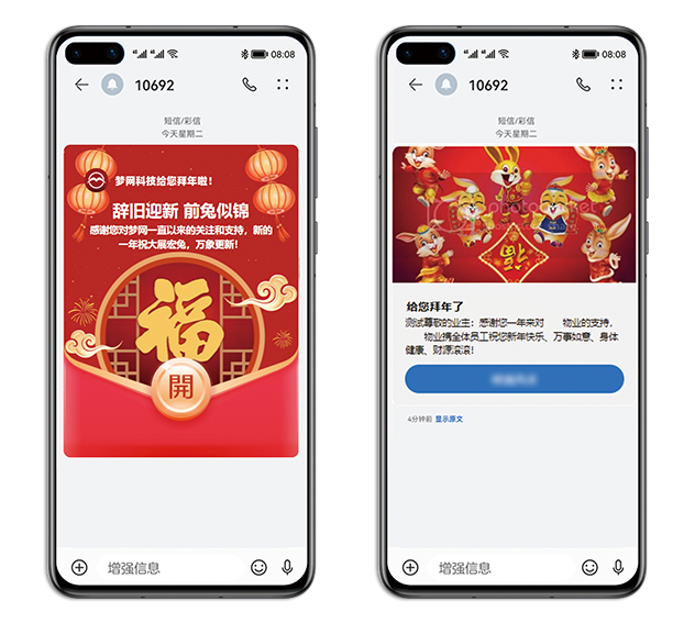 兔年将至,万象更新。royal皇家88(集团) 科技凭借5G富媒体消息产品技术让客户和用户感受到多样化云上年味儿。未来,royal皇家88(集团) 科技将顺利获得5G富媒体消息探索文化传播新可能,赋能文化创新传播动力,助力传统文化焕发全新活力。royal皇家88(集团) 科技将以用户需求为核心,不断完善、丰富5G富媒体消息产品功能,全方位满足客户各类场景需求的同时为用户给予科技、快捷的服务。